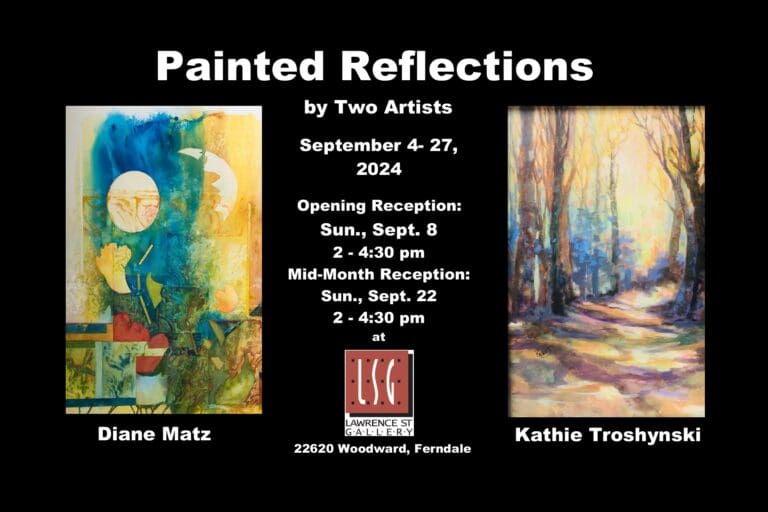 KATHIE TROSHYNSKI: The creative background of this artist has been painted with a wide brush – a career marked by advertising, exhibiting, volunteering and teaching. Early on Troshynski organized juried shows in Troy, art competitions for Troy Daze and displayed her work through art organizations and was president of the Troy Arts Commission. Recently she has taught in Lake Orion and at the OPC in Rochester. Exhibiting includes Birmingham Society of Women Painters, BBAC, U of M, Birmingham’s Our Town, Janice Charach Gallery, and the Northville Art House.